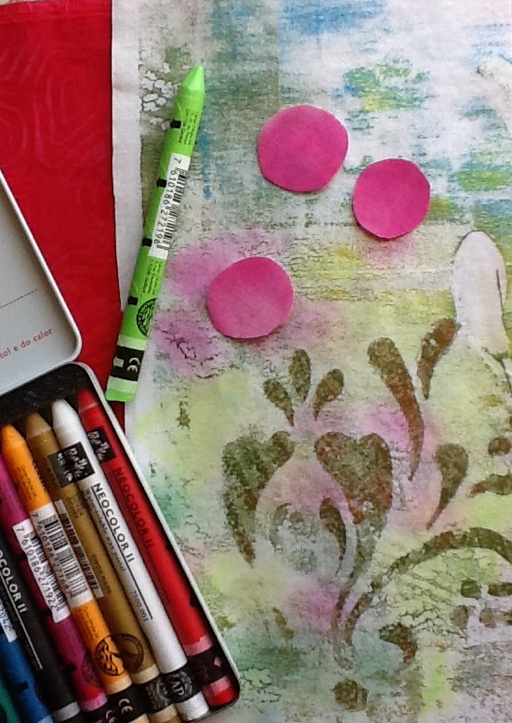 I've had a snippet of time to dabble with my art pieces, adding some colour to one with the Neocolor II crayons and I cut out a few circles to fuse onto it. This was a print that dint take the paint well and there was a lot of white.
