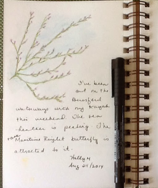 After supper, and a bit of a rest, I felt rejuvenated and took my paints into the yard to do a quick sketch of the cone flowers against the fence. I'm almost embarrassed to post the picture, but I am. I haven't painted outside in ages and need to get used to how fast the paint dries in the breeze. It is what it is; it's all about the process and the feeling of doing it. I want to do more. And of course I brought another piece of seaweed home from the beach. Endless possibilities!